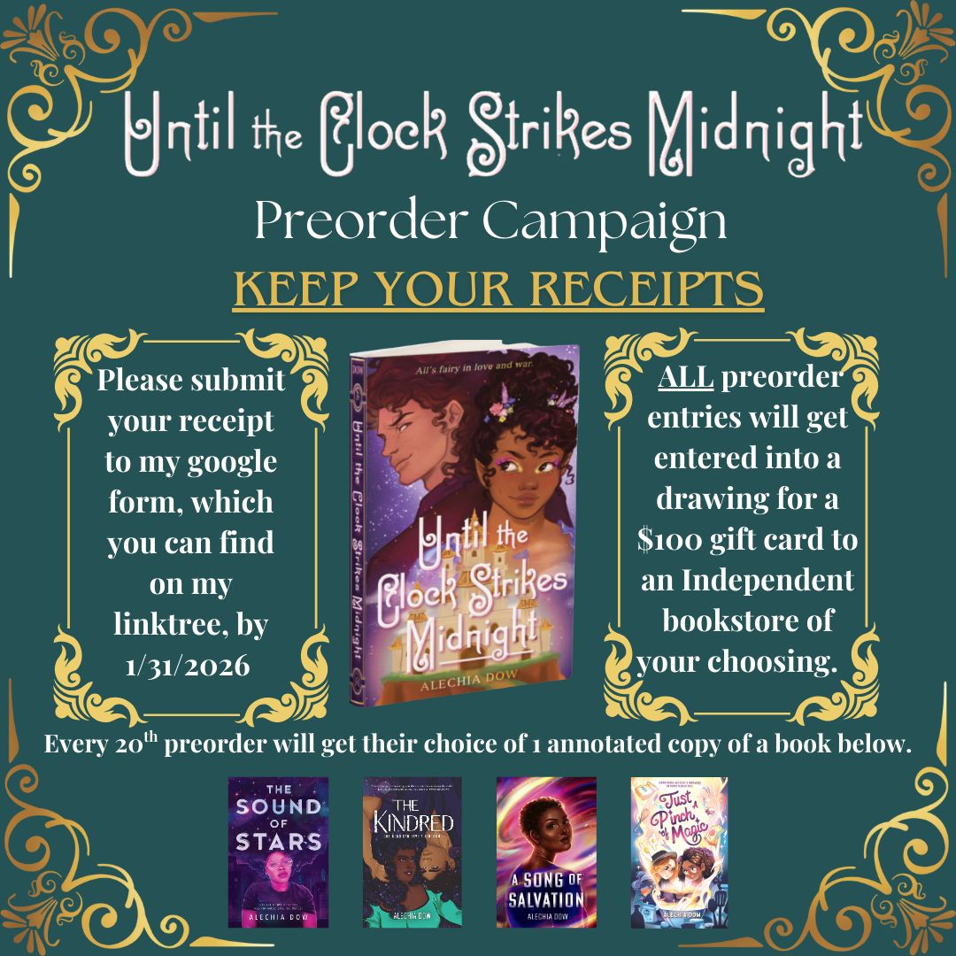 All of this showed me the book community, made me realize that people can see you, and if they can, they want to support you. Not everyone can––but just telling your library, your local indie, and your friends about my books is super helpful and won’t require you to spend a dollar. Anyway, here’s more info about the preorder campaign I told you about last newsletter. Every 20th (had to change this because shipping from Germany is rough) preorder can win their choice of one annotated copy of my books. All preorders will be entered into a drawing for a $100 gift card to an independent bookstore of their choosing. You can enter your receipts here: https://bit.ly/PreorderUtCSM ——this is a google form. If you don’t have google, you can write me here and we’ll work it out: https://www.alechiadow.com/contact. One last thing, you can order signed + swagged copies of Until the Clock Strikes Midnight at Mysterious Galaxy and An Unlikely Story. Hopefully more to come!!